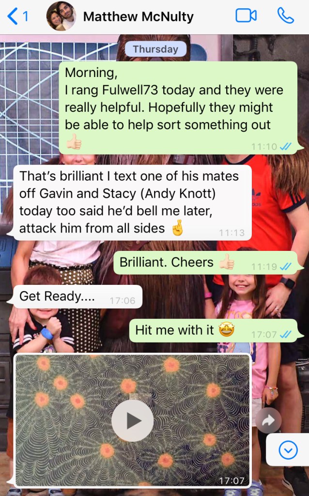 By Thursday morning I was on the phone to Fulwell73, the agency of James Corden. I was now confident we could get something (I think Victoria also had the same feeling as she said she’d sent an email to Hugh Jackman’s agent!). I had also sent a tweet to James Corden but I wasn’t that confident of him seeing that as he has well over 10 million followers on Twitter! I messaged Matthew McNulty to let him know I’d contacted Fulwell73. He replied to say that he’d text one of his mates who was in Gavin and Stacey, an actor by the name of Andy Knott. We were now as Matthew said “attacking him from all sides”. Then at 5.07pm came the message of all messages! I pressed play on the WhatsApp video message. the sound of a male voice singing Happy Birthday and the camera panning round to reveal… JAMES CORDEN!!!!! WTF!!! I couldn’t stop smiling, inside and out. A sense of just pure joy! I immediately ran upstairs to show Louise, we both looked at each other in shock but the feeling was just amazing! I just wanted to show Mila-Rose and Alfie there and then to see their reaction but that would just spoil the whole surprise. That evening everything just snowballed, we started to get messages from footballers Emile Heskey, Jermaine Jenas, Robbie Savage, Robbie Fowler, Jason McAteer, Adam Lallana, Leon Osman and Chris Kirkland. All but one of these were courtesy of our good friend, Gail Ashton, she had kindly fundraised for Alfie in the past. Her brother-in-laws brother is ex-Liverpool player, Stephen Warnock. He had brilliantly rallied the troops to get pull all these messages together. We have amazing friends who are just so kind and will always go out of their way to help. That evening we also had a call from Victoria, we would be on Granada Reports on Friday – LIVE!