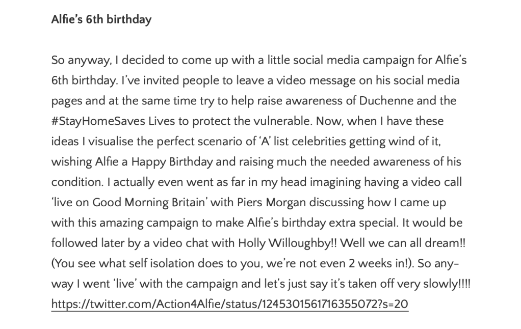 I’m so proud of what I’ve achieved and I’ve given our family and friends a memory that will definitely last forever. From the moment of Alfie’s diagnosis, my/our aim has been to try and make the worst case scenario into a positive. My main target for this project was to first and foremost make Alfie’s 6th birthday as special as possible and with the help of our fantastic family and friends we’ve achieved that. I also wanted to raise awareness of his condition, Duchenne Muscular Dystrophy and given one phone I’ve had already this week it looks like that could well be achieved in the coming days. I’m not a medical expert, I won’t ever personally ever be able to find a cure. My aim when I started Action4Alfie was to make sure people knew about DMD and that no parent went through what we went through at the time of diagnosis. If just one of these high profile celebs can stick with us and maybe help in anyway then I’m sure someone of great importance may just stand up and take note. So that’s about it really, I know I’ve gone on a bit but this blog is now documented for both Mila-Rose and Alfie to look back on in years to come and if someone asks them what did you they do during the Coronavirus lockdown of 2020. They’ll say “Well, let me tell you a little story…”