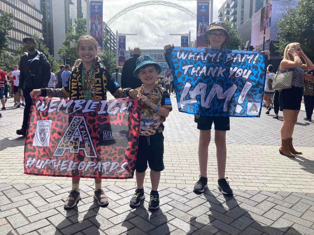 My Dad was trying to explain to him how he was there back in 1971 when Leigh last won the cup and how it was a week after he’d married my Mum. Two takes later and he still ended up on the cutting room floor!!! Alfie gave a bold prediction of 16-0 to Leigh and Louise repeatedly said how amazing the occasion was!!! Maybe we were just overwhelmed by the reality of where we were and how big this occasion was. We seemed to be outnumbered by Hull KR fans on Wembley Way, the red and white adorning their fans was bold and bright whilst the leopard print was almost like camouflage. As time went on, step by step we discovered more Leythers and soon enough the leopard print was appearing everywhere!